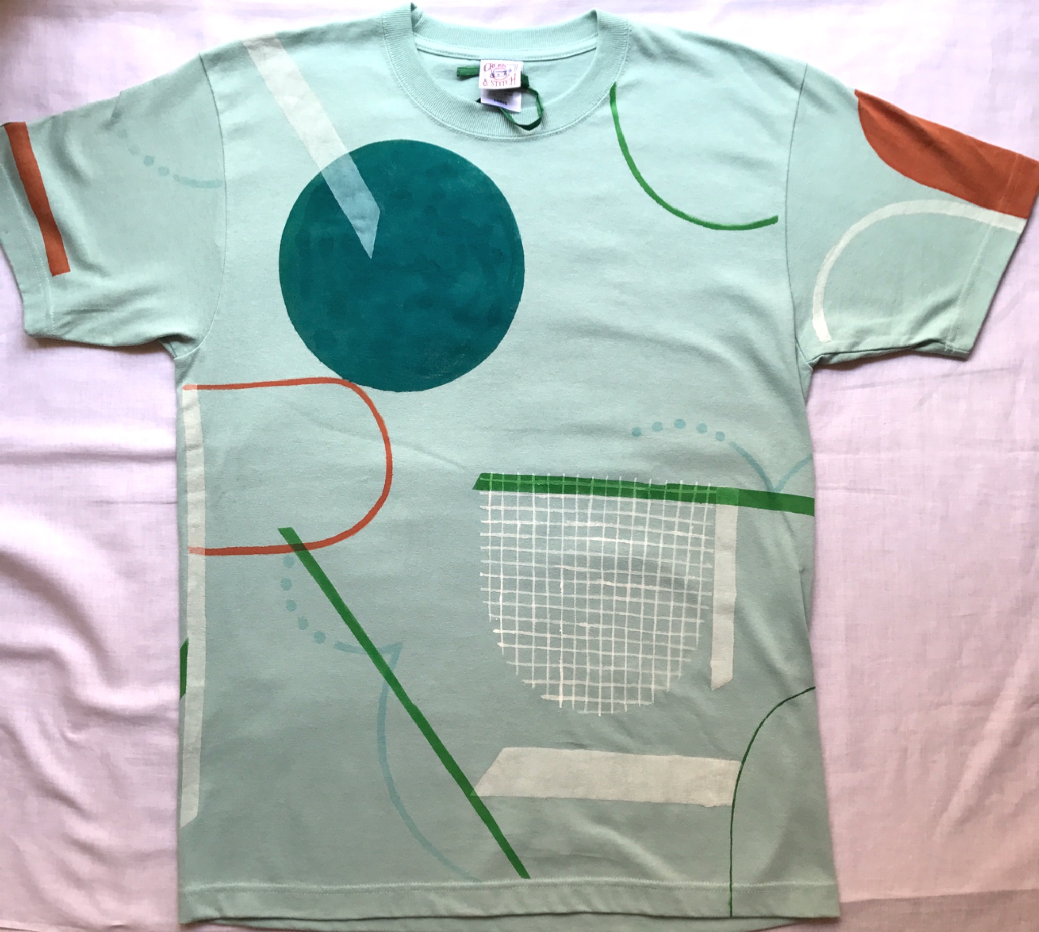 cocoaのTシャツ展レギュラー作家さん。毎年梢さんのTシャツを楽しみに待っている方も多いです。今年のテーマは「Ball」。球技を行うコートをイメージして構成した柄。ボールのように弾んで、野球のボール判定のように、枠からはみ出しても楽しんでもらえるように(梢さん談)。