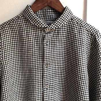 丸衿がかわいらしいリネン素材のギンガムチェックシャツ