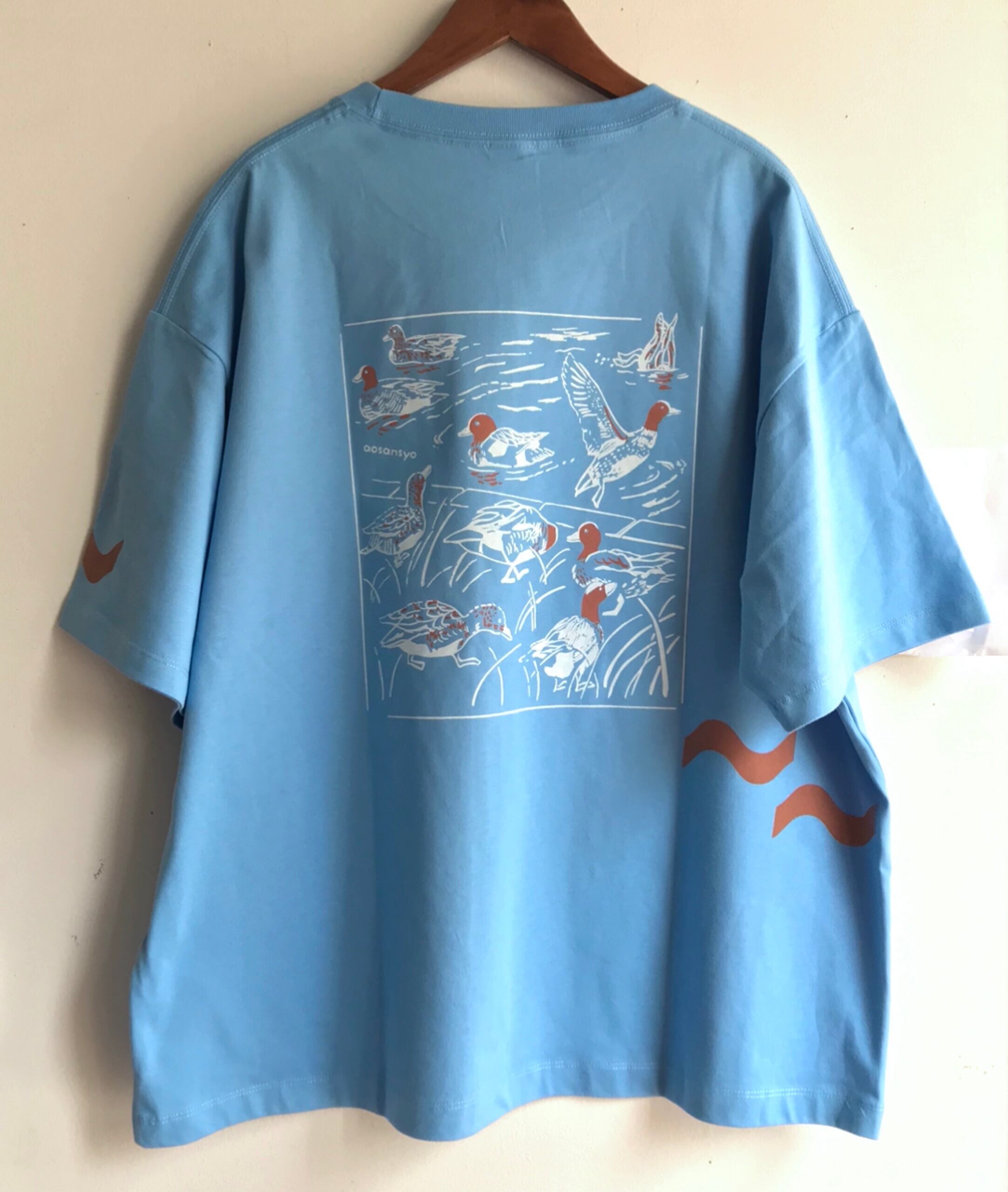 【2025年Tシャツ展】aosansyo カモメとカモ 1点物Tシャツ サックス Mサイズ【ハンドメイドTシャツ・作家作品】