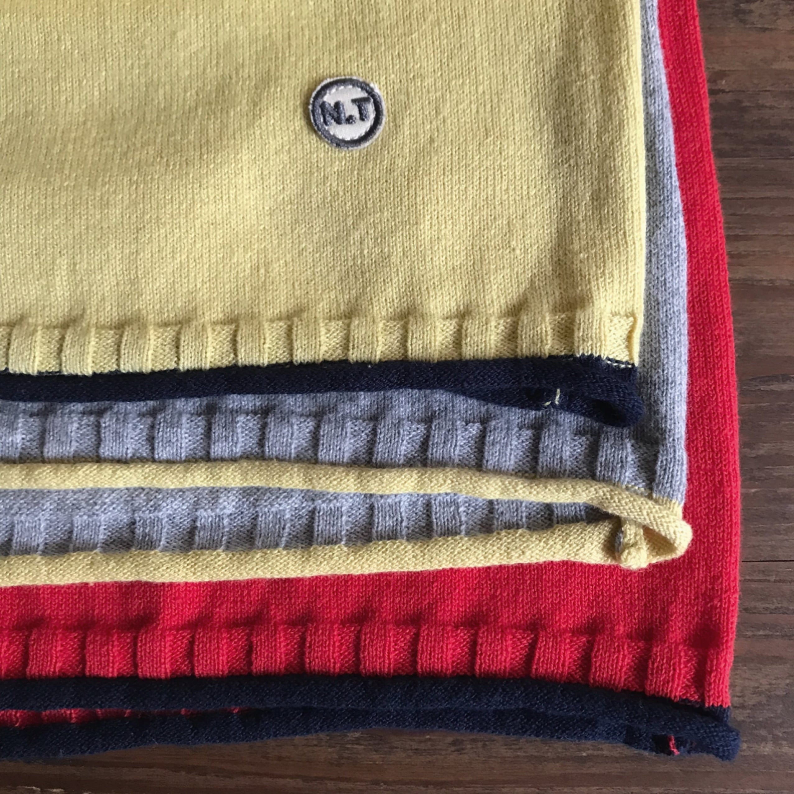 衿と袖口はスッキリと見せててくれるリブ編みに、裾は配色のカールをさせたデザインと小さなロゴがポイント。