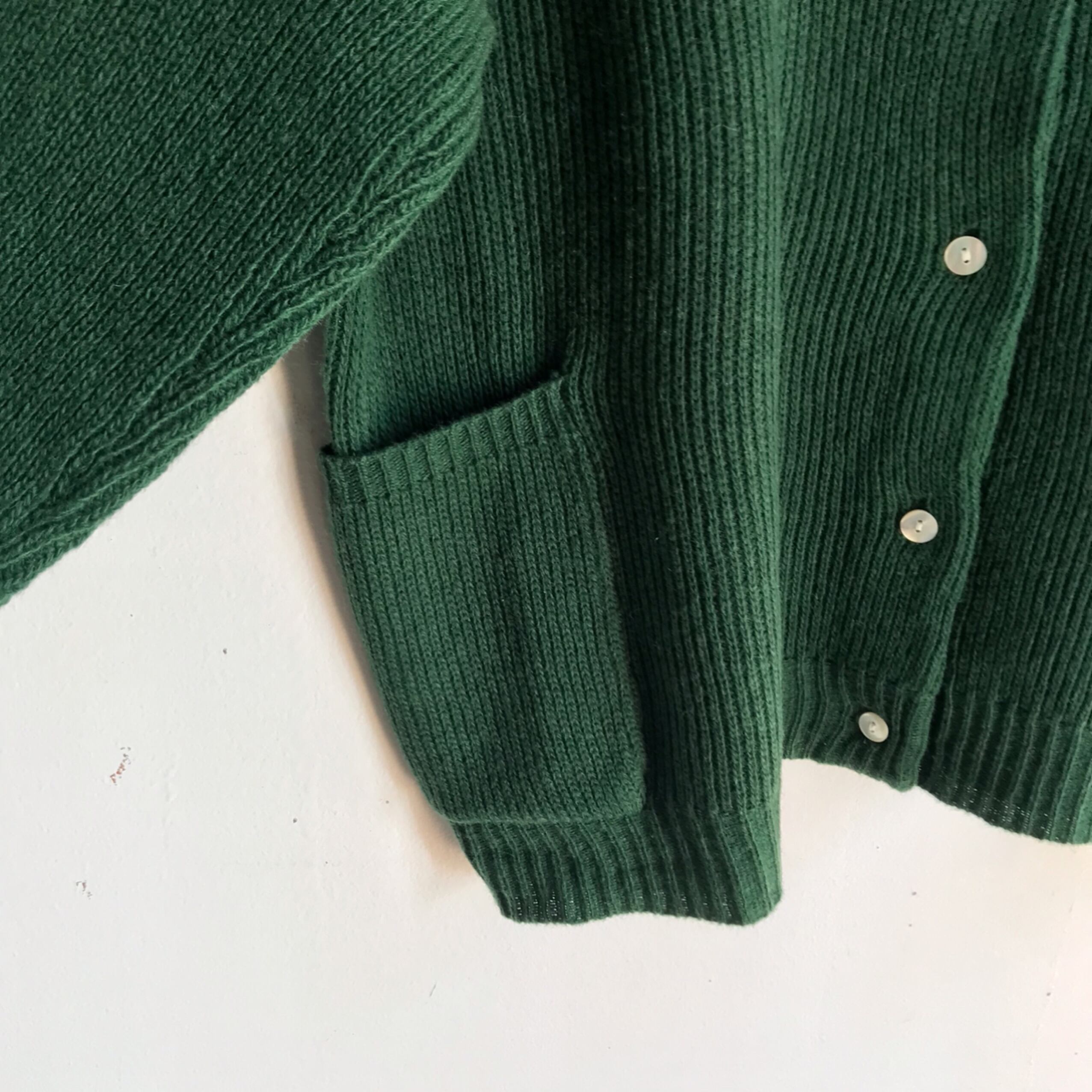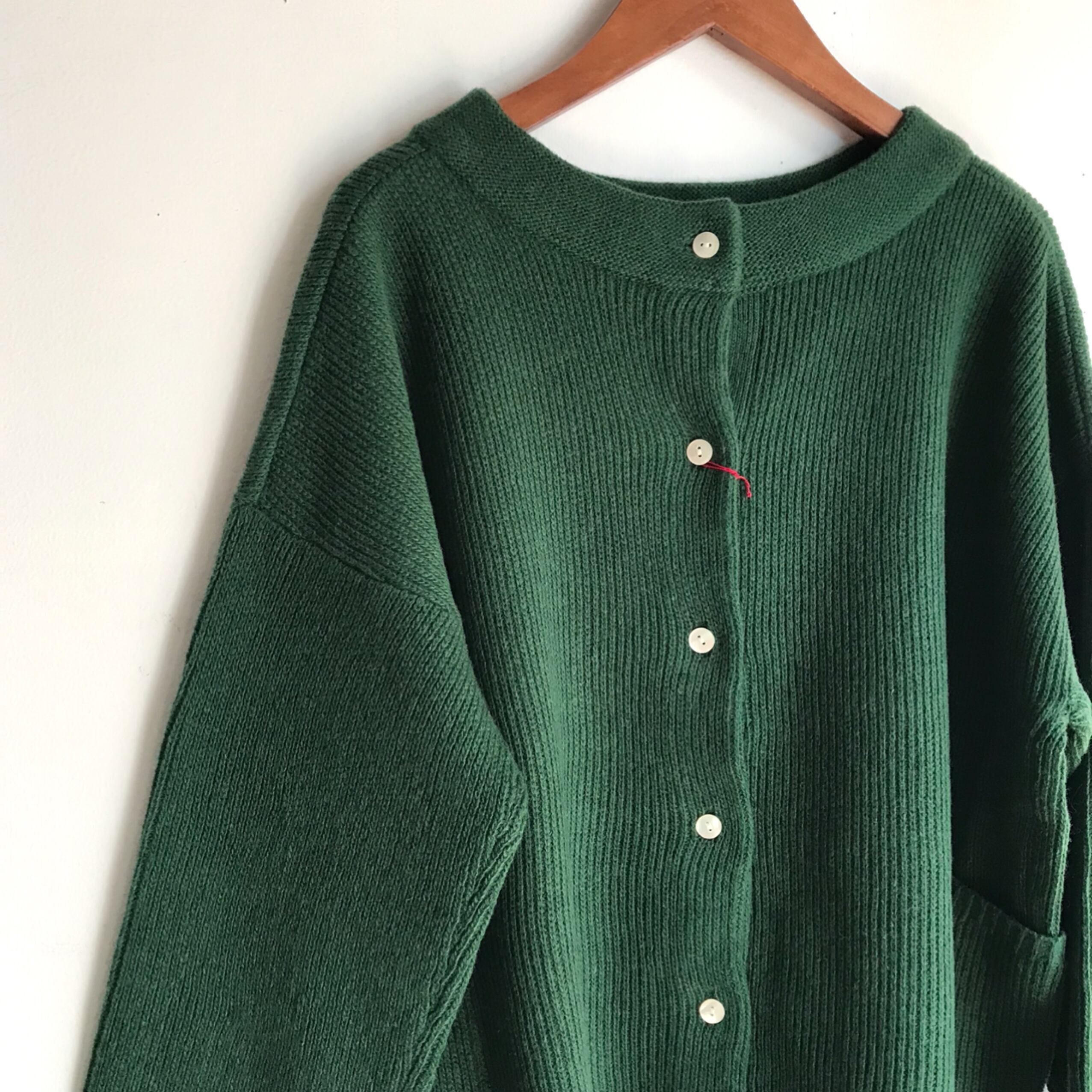 シェルボタンが上品で短め着丈と両脇のポケットもポイントになります。