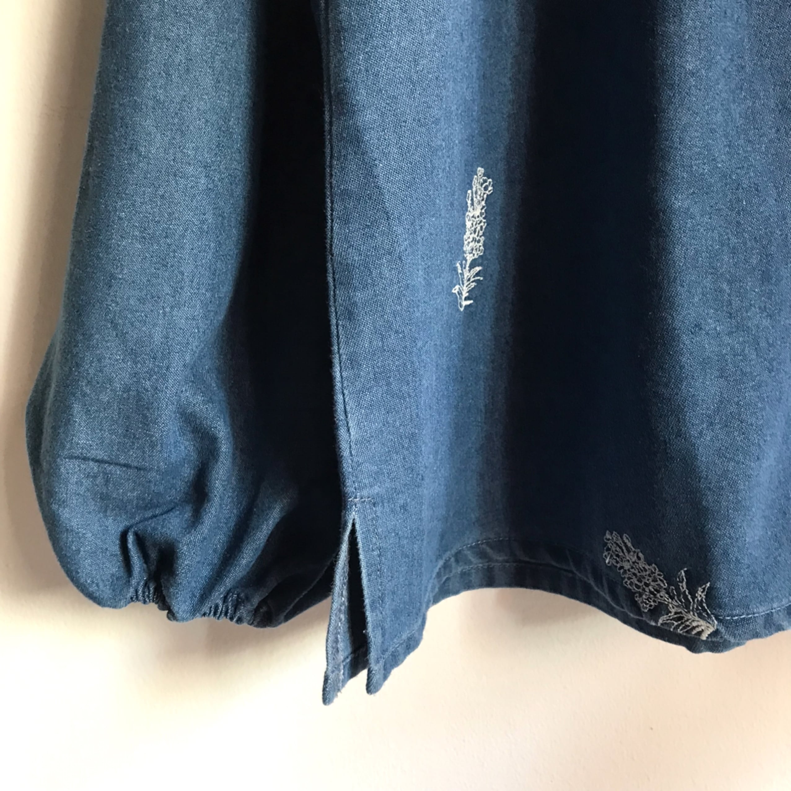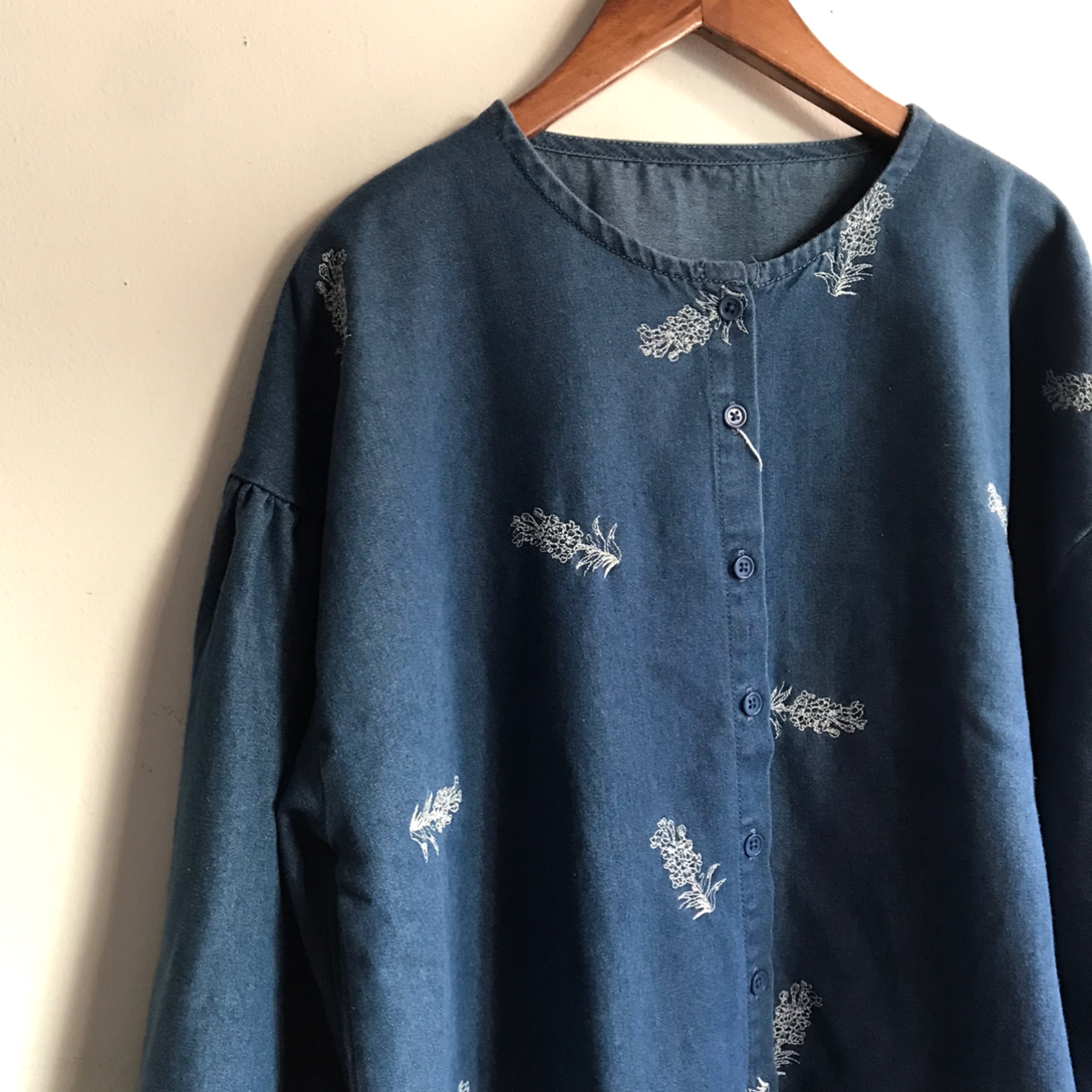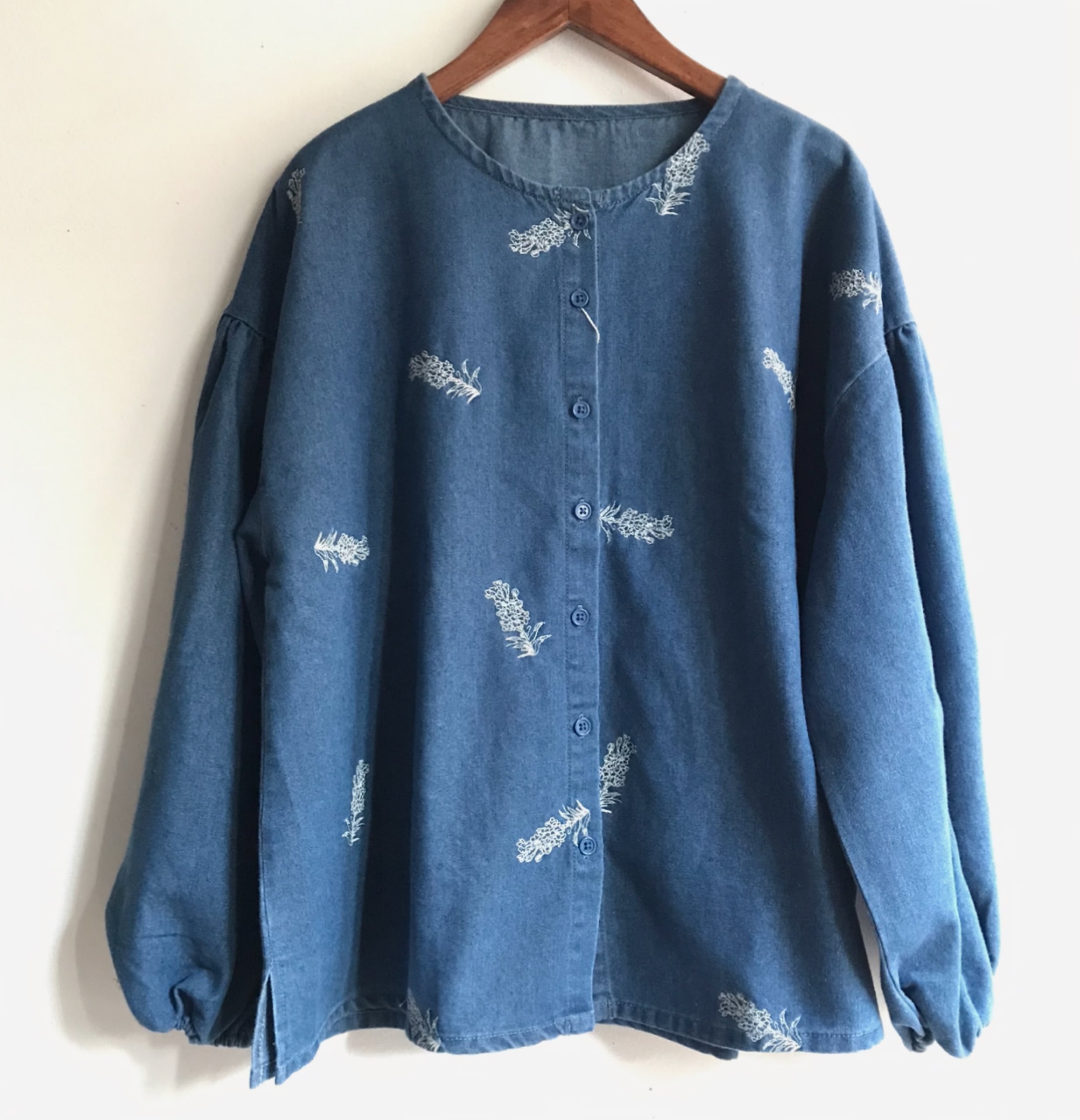 ライトオンスデニムにストックモチーフの刺繍をあしらった前開きブラウス。