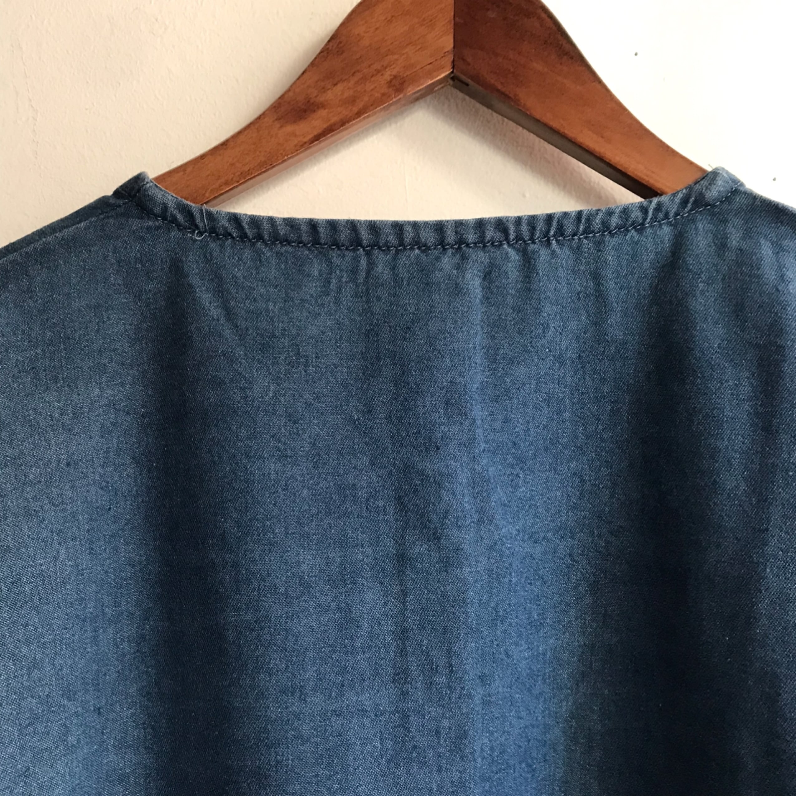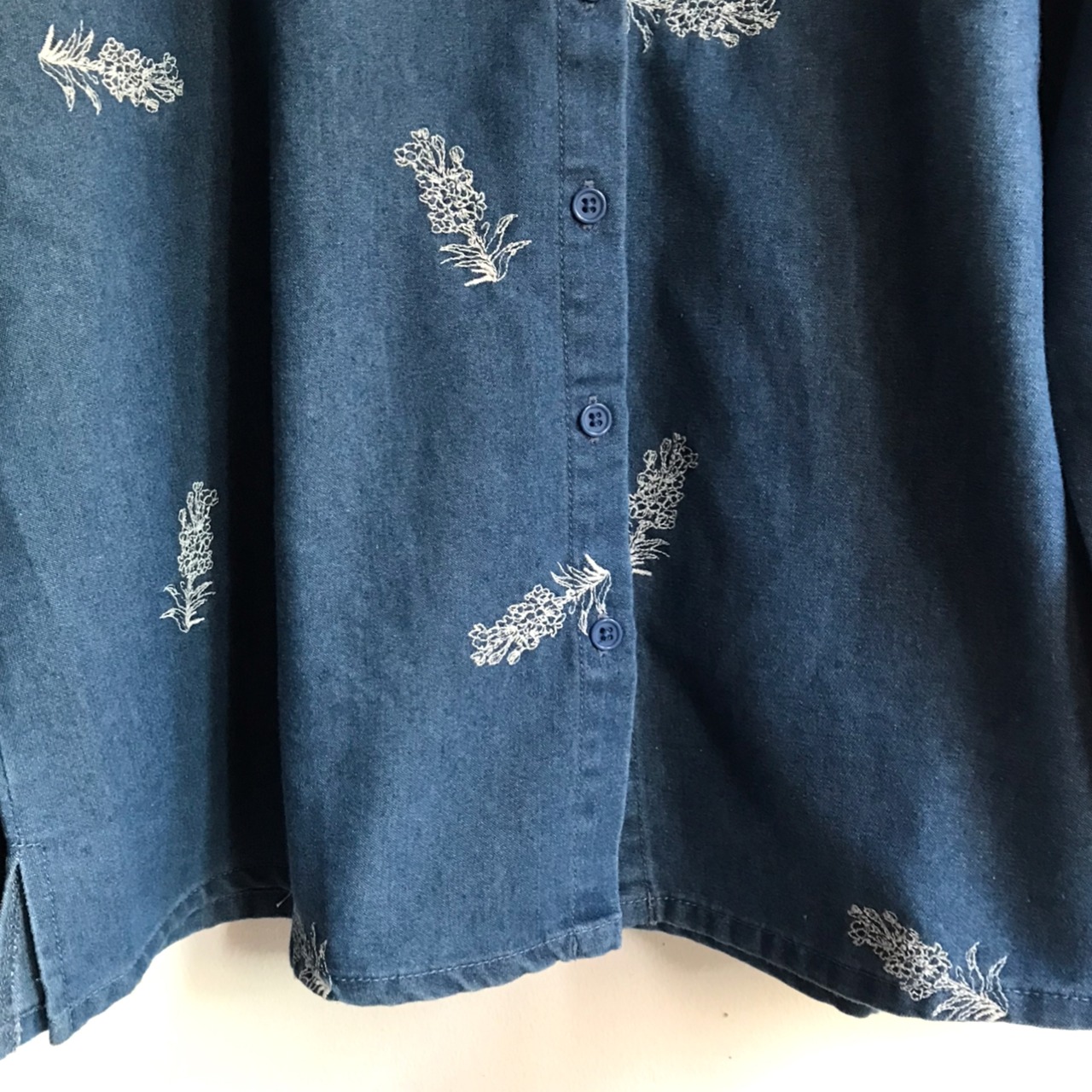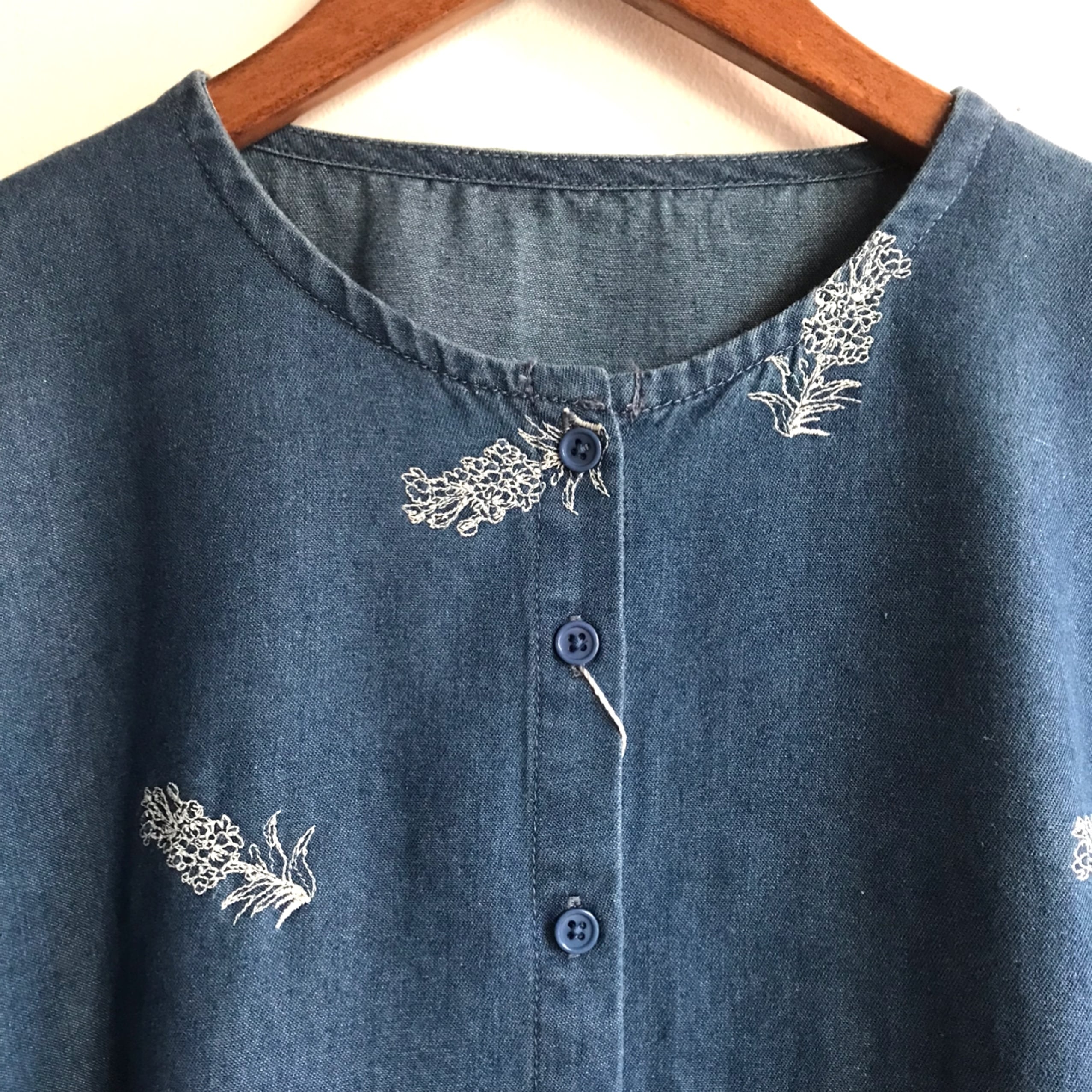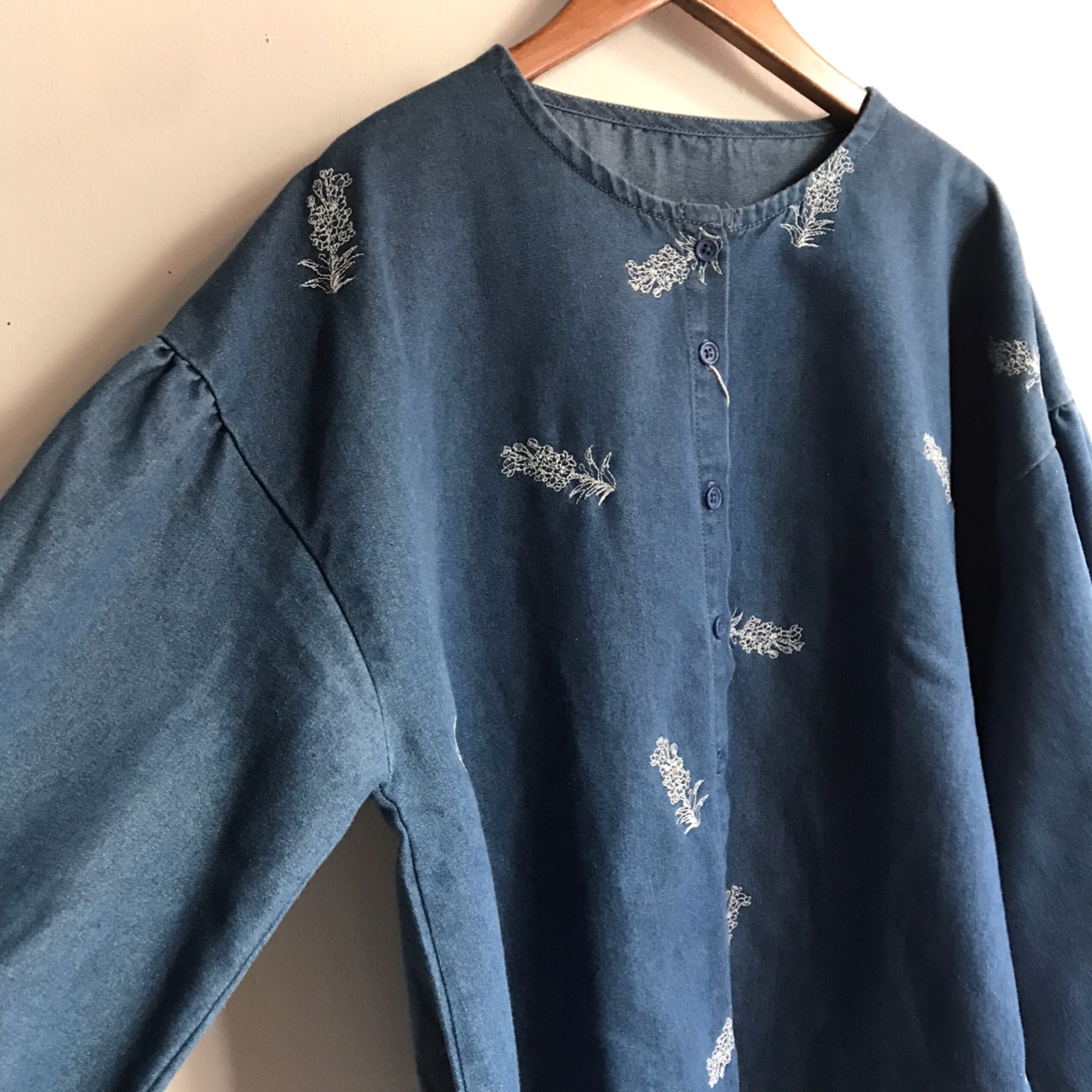 ライトオンスデニムにストックモチーフの刺繍をあしらった前開きブラウス。