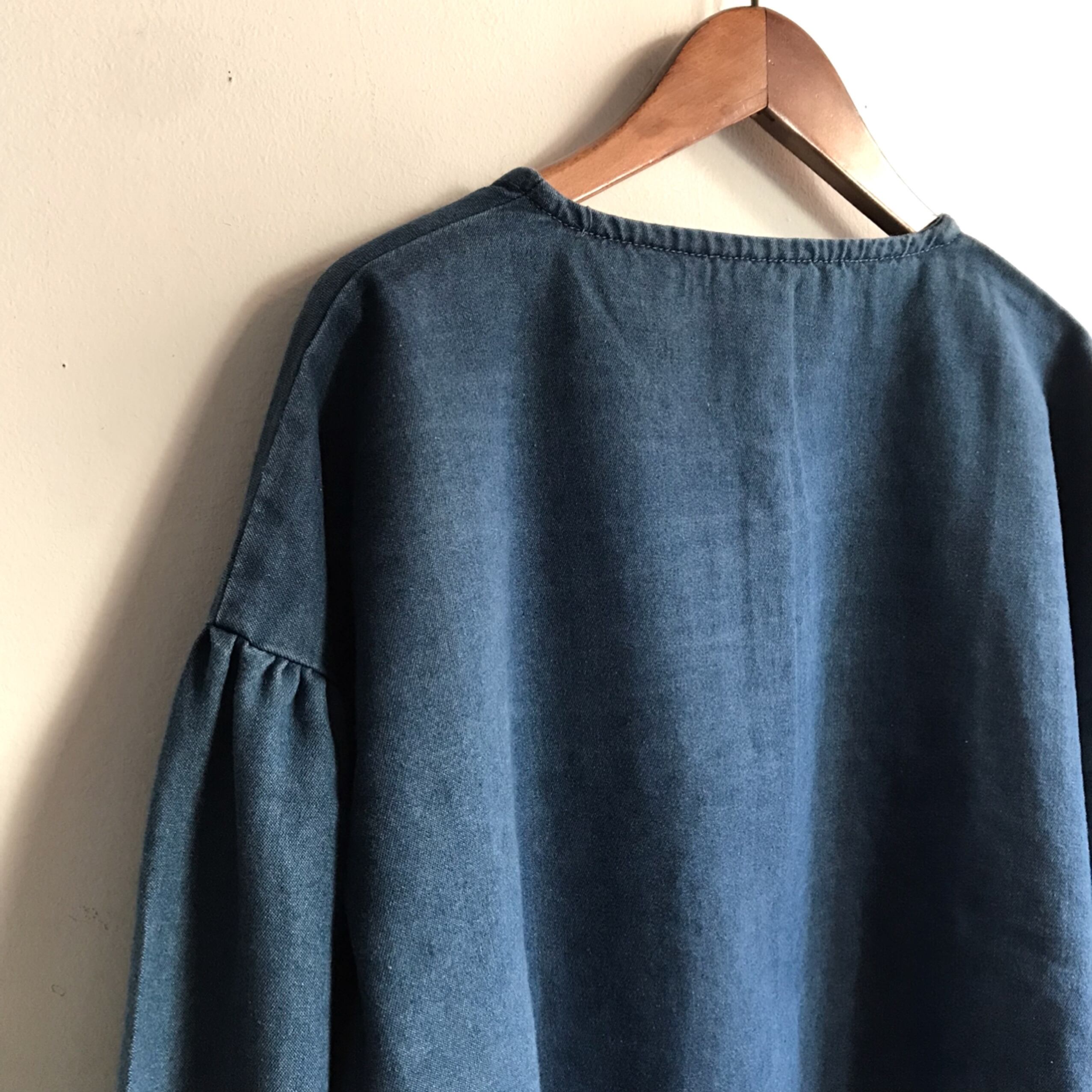 ノーカラーで衿まわりはスッキリ、袖口はゴム入りでふわっとしたシルエットになります。
