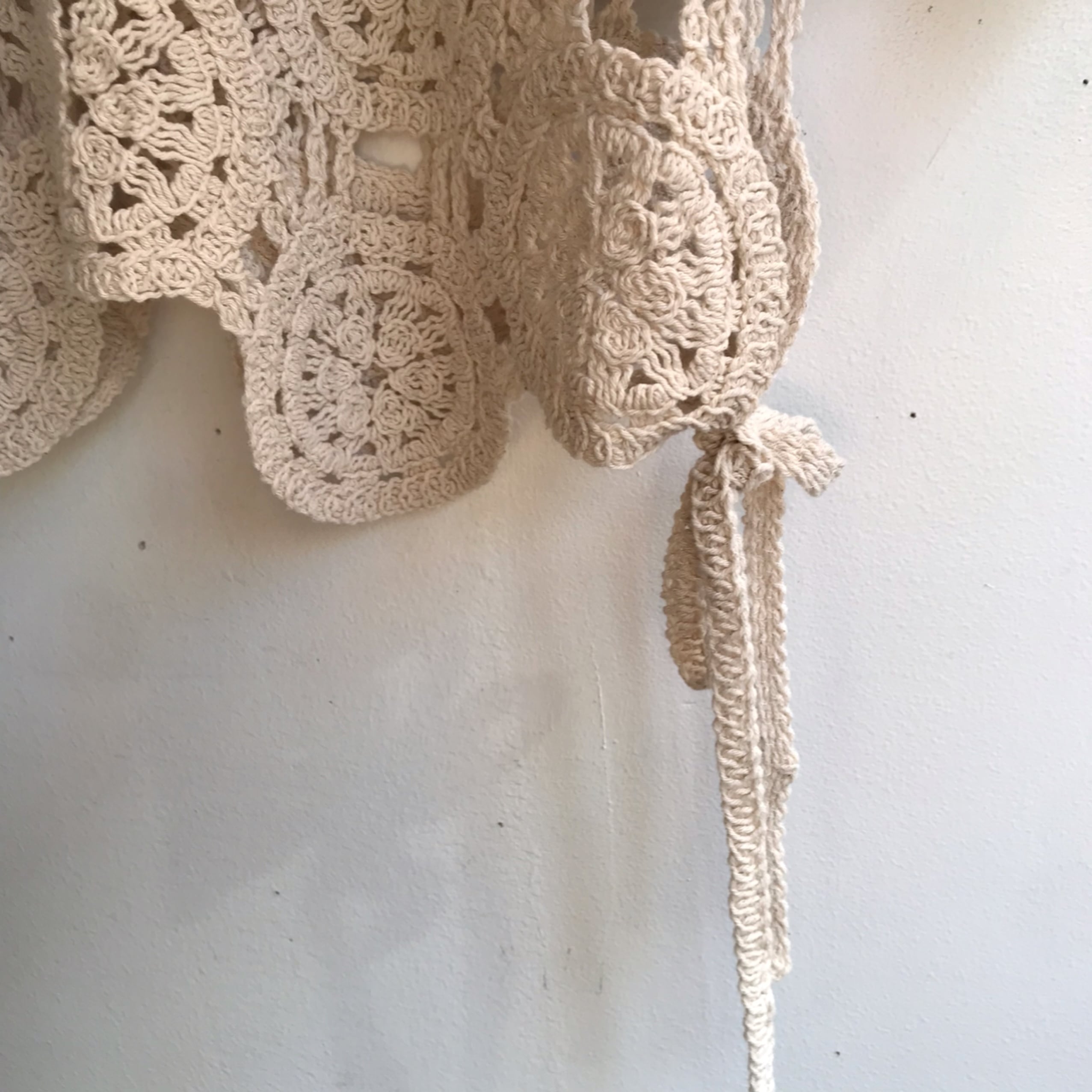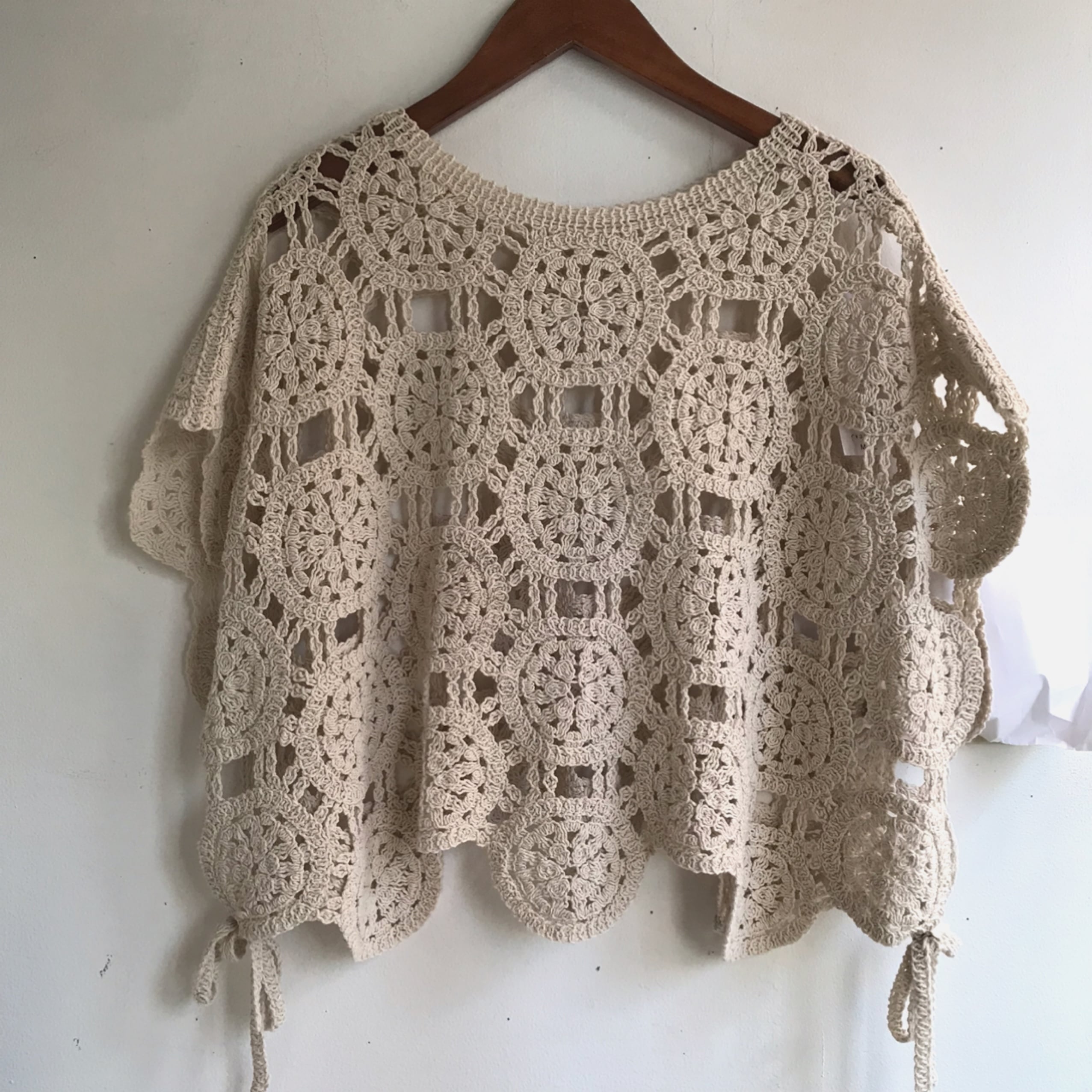 ワンピースやブラウスなどと合わせやすいコンパクトな丈感のクロシェ風ベストです。