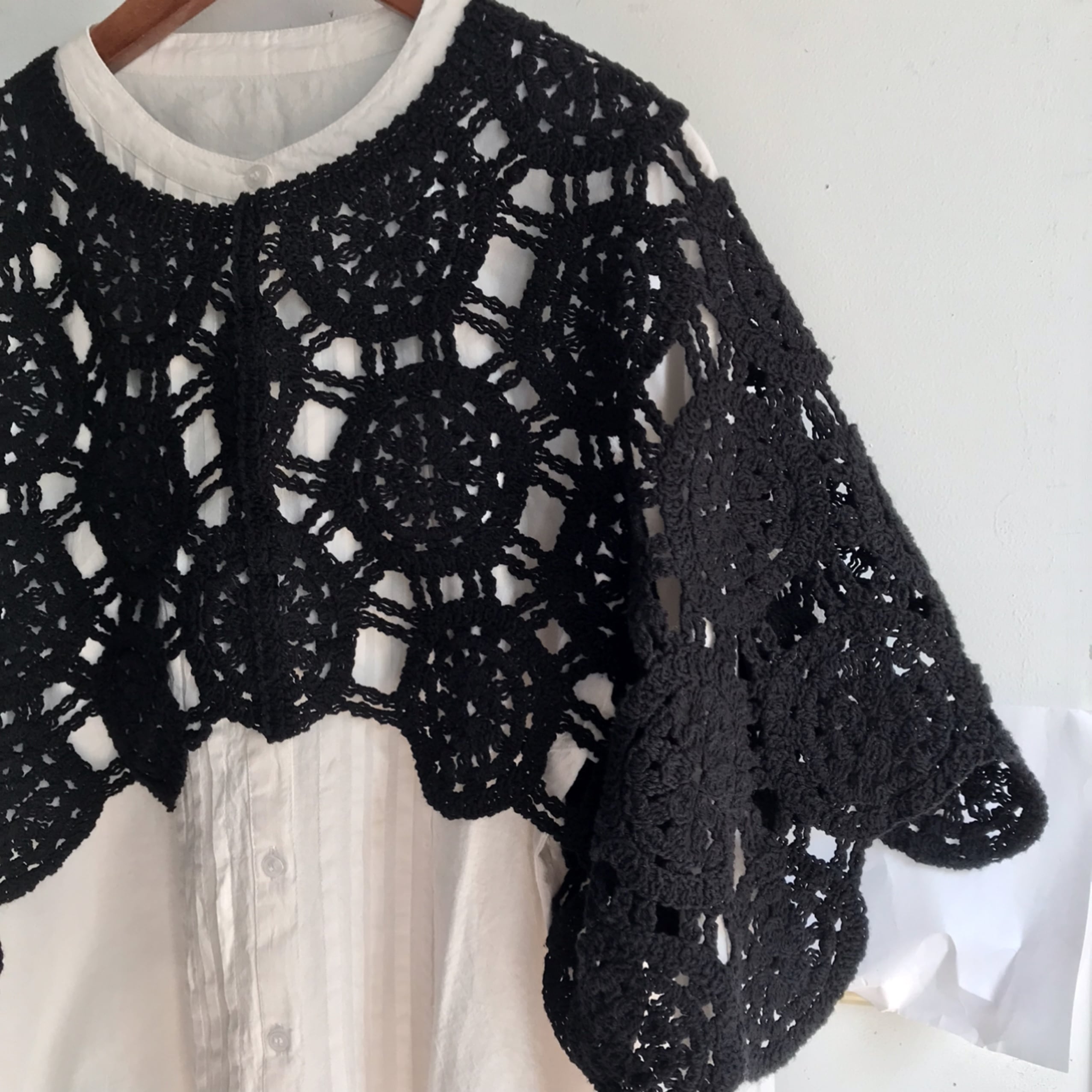 ワンピースやブラウスなどと合わせやすいコンパクトな丈感のクロシェ風ベストです。
